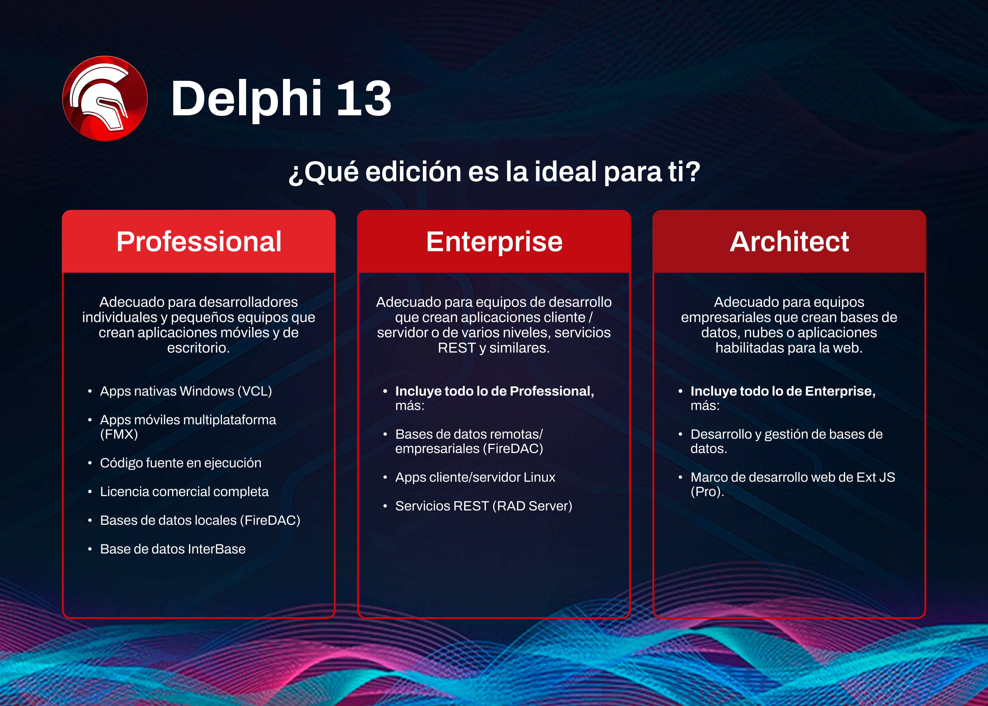 La mejor integración con Windows, potentes características de diseño visual y hasta 5 veces más productividad hacen de Delphi® el IDE definitivo para crear aplicaciones nativas de código único para cualquier plataforma.